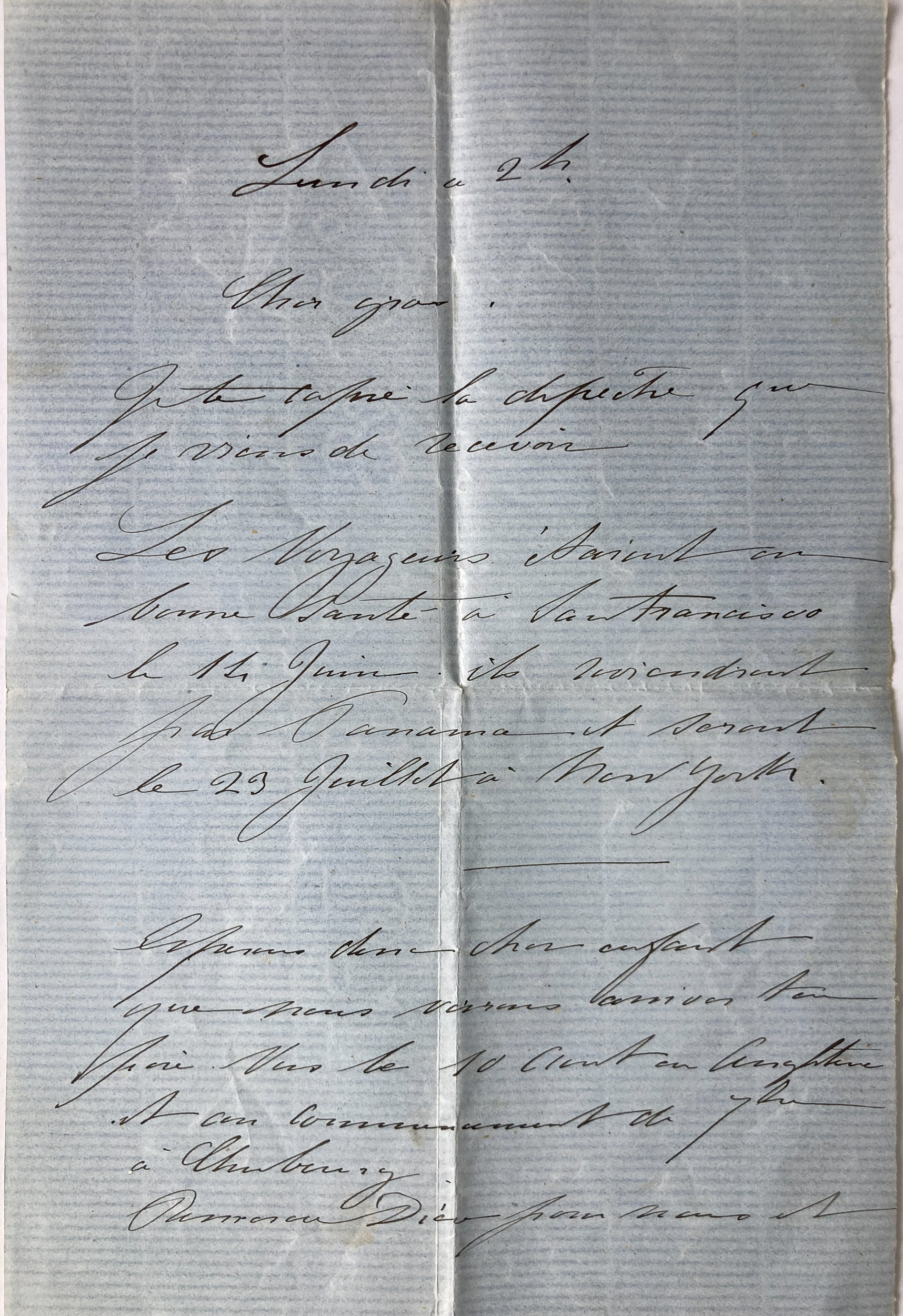Les Voyageurs étaient en bonne santé à San Francisco le 14 juin. Ils reviendront par Panama et seront le 23 juillet à New York.