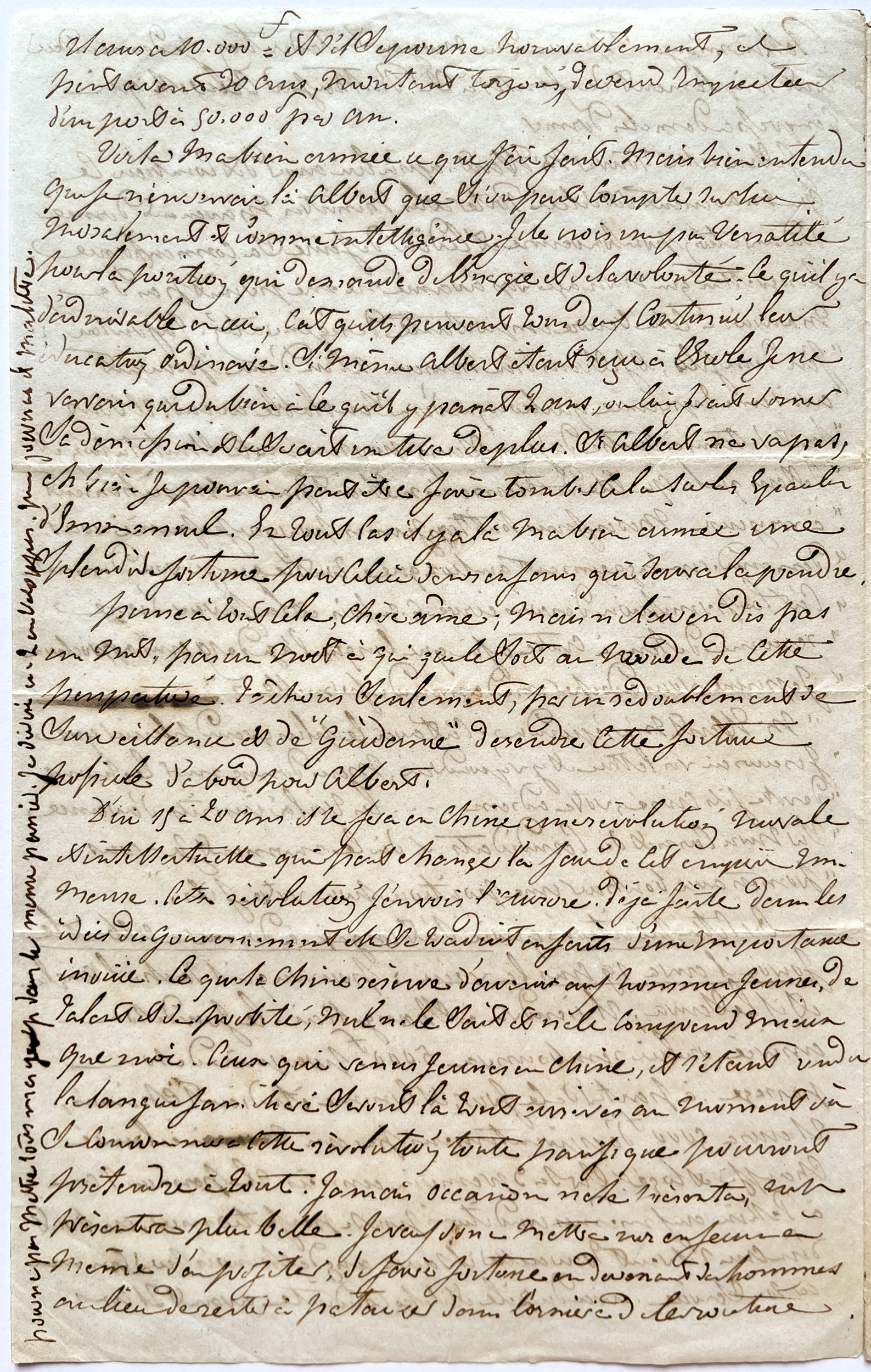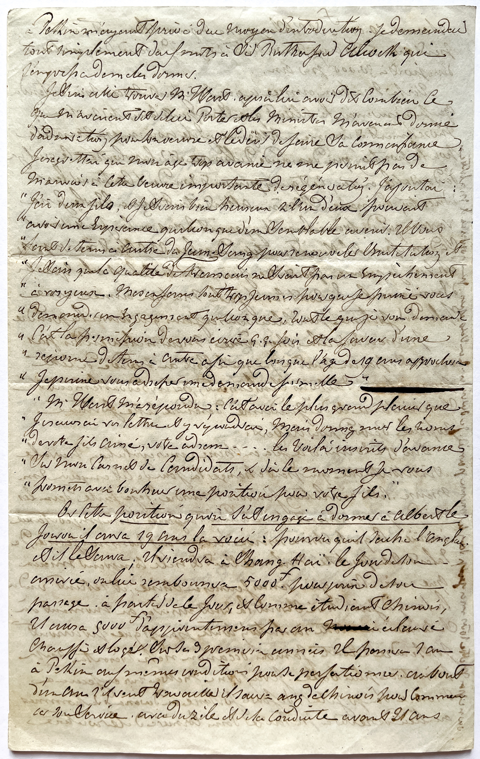 Cette lettre, dont il manque la première page, relate le déplacement à Pékin d'Auguste et son échange avec Sir Robert HART concernant l'avenir de son fils Albert (16 ans)