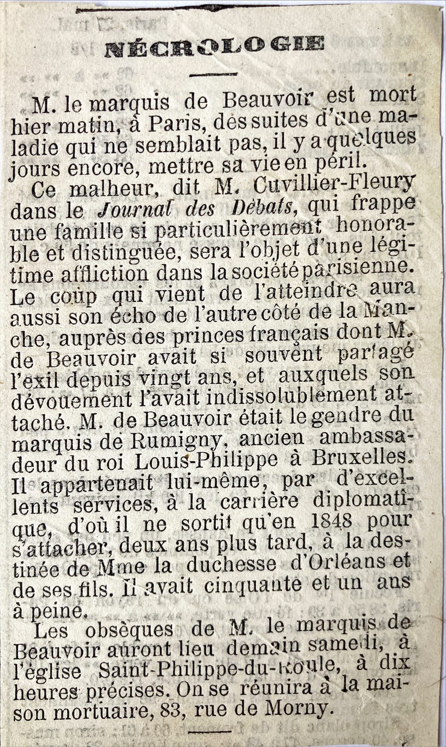 nécrologie Marquis de Beauvoir (25 mai 1870)