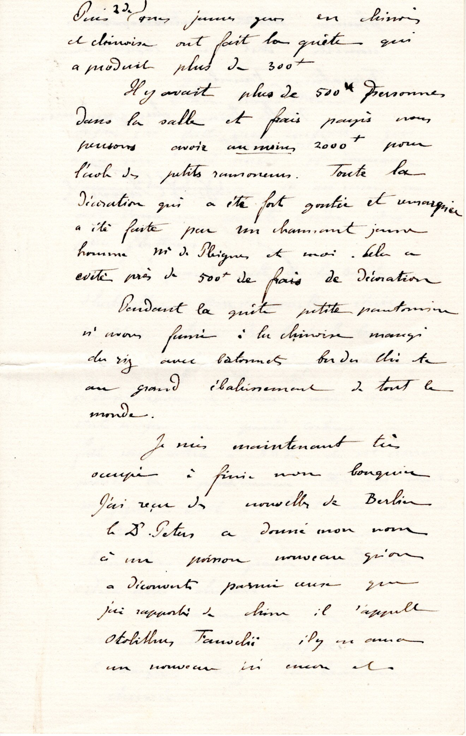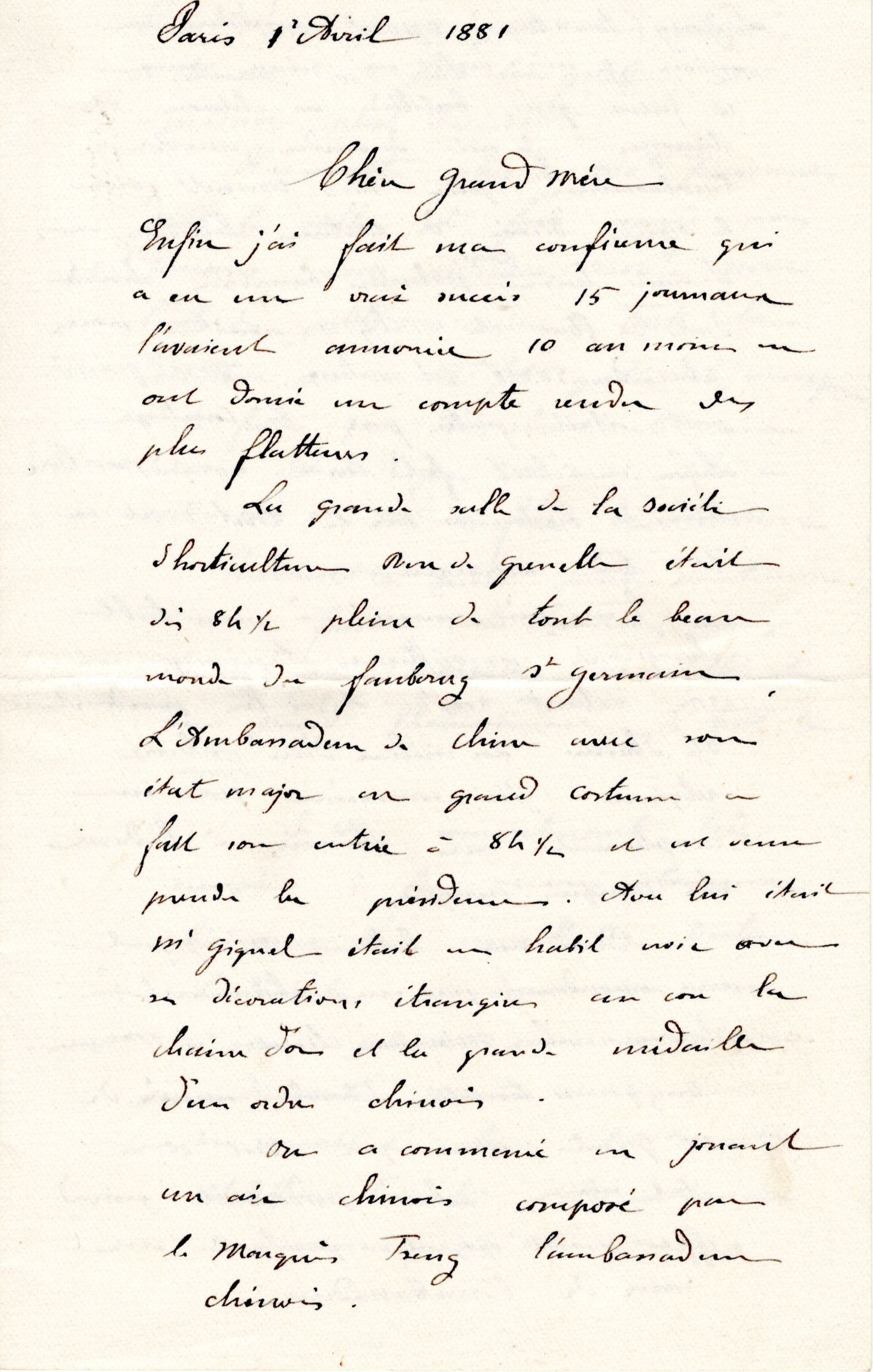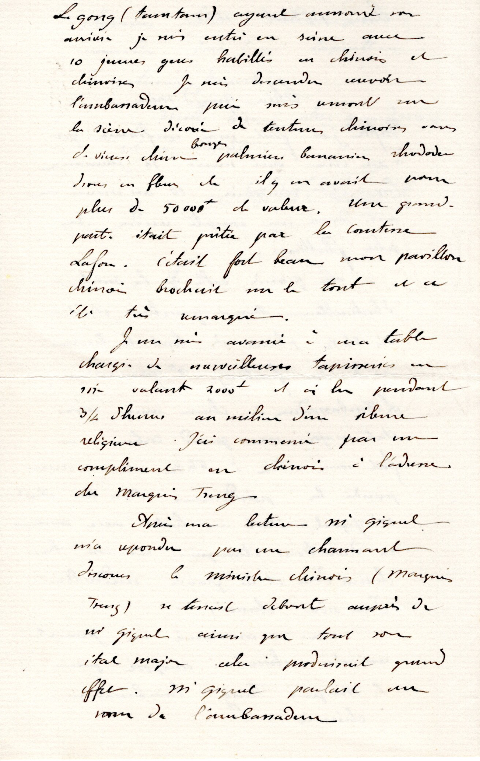 . il s'agit d'une réception majestueuse dont Albert semblait être un des organisateurs et pour laquelle il décrit la munificence chinoise. Cette manifestation se déroule en présence du marquis Tseng (1839-1890), ancien ambassadeur de Chine auprès des cours de Londres, de Paris et de Saint-Catherine.