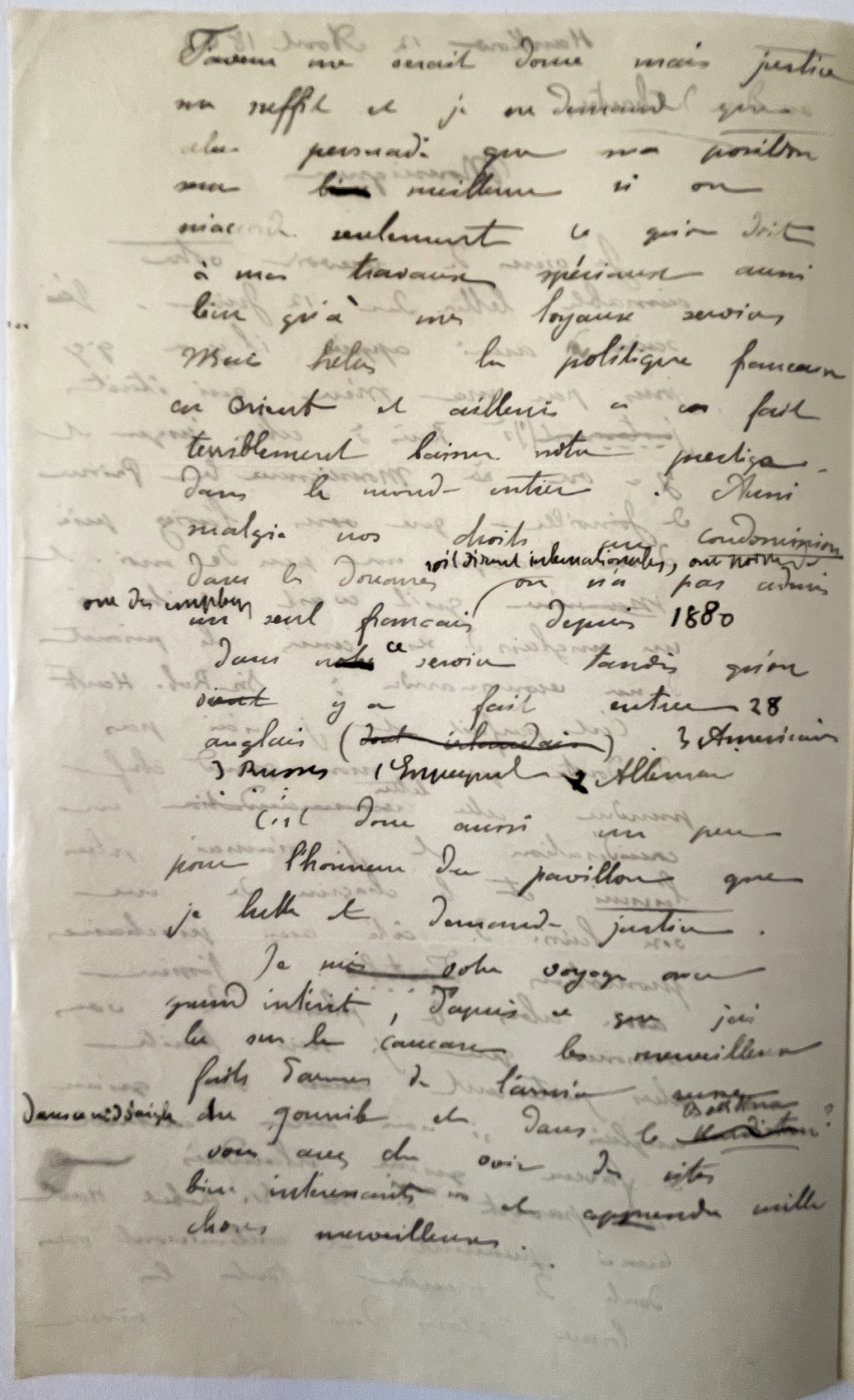 "Dans les douanes, soit disant internationales, on n'a pas admis un seul français depuis 1880 dans ce service tandis qu'on y a fait entrer 28 anglais, 3 américains, 3 russes, 1 espagnol, 1 allemand..."