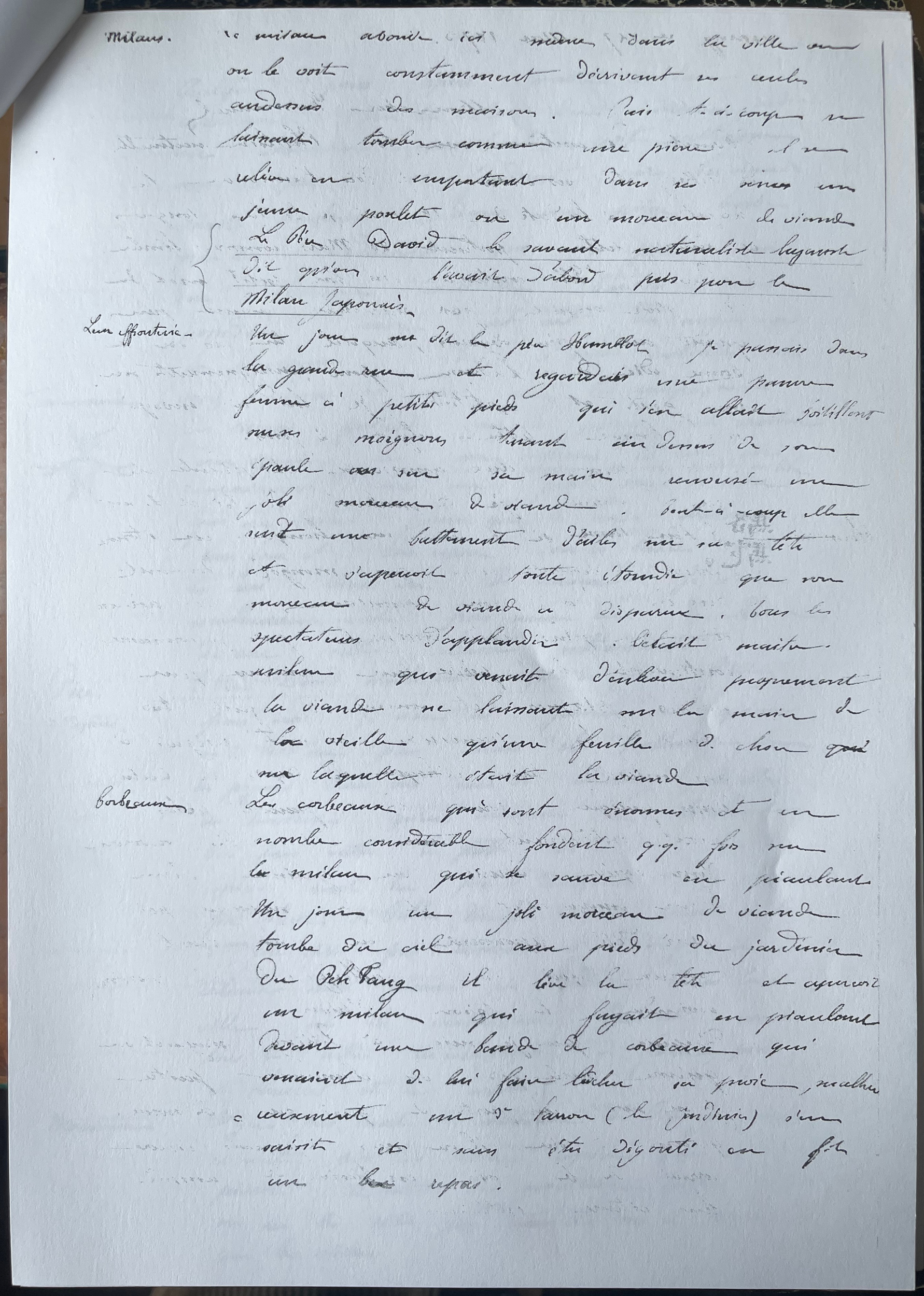 ... qui sont énormes et en nombre considérable fondent quelquefois sur les milans qui se sauvent en piaulant. Un jour, un joli morceau de viande tombe du ciel aux pieds du jardinier du Peh-tang (nota ; signifie Église du nord – nom de la cathédrale Saint Sauveur de Pékin, mission catholique gérée par les Lazaristes). Il lève la tête et aperçoit un milan qui fuyait en piaulant devant une bande de corbeaux qui venaient de lui faire lâcher sa proie. Malheureusement, un second larron (le jardinier) s’en saisit et, sans être dégoûté, en fit son repas.