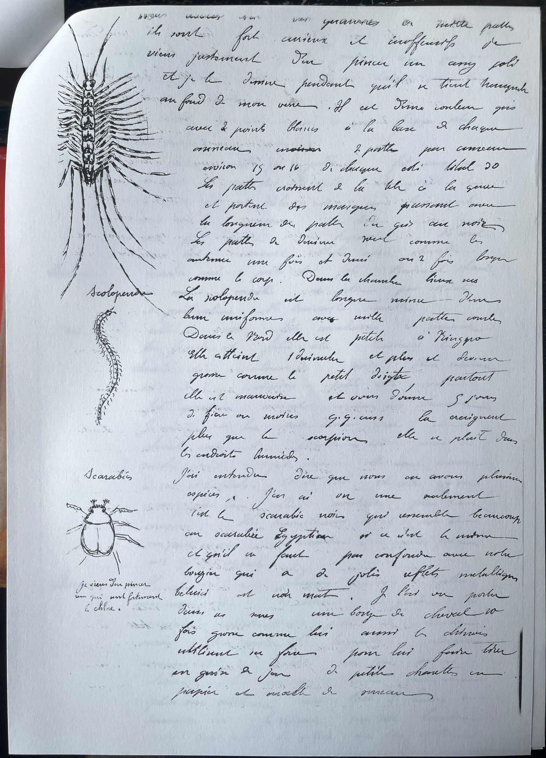 Nous avons sur des graminées, des mille pattes. Ils sont fort curieux et inoffensifs. Je viens justement d’un pincer un assez joli et je le dessine pendant qu’il se tient tranquille au fond de mon verre. Il est d’une couleur gris avec deux points blancs à la base de chaque anneau. Les pattes pour commencer, environ 15 ou 16 pattes de chaque côté soit au total 30. Les pattes croissent de la tête à la queue et portent des marques passant sur la longueur des pattes sur la longueur des pattes du gris au noir. Les pattes arrières sont comme les antennes une fois et demi ou deux fois la longueur du corps. Dans la chambre, lieux secs.