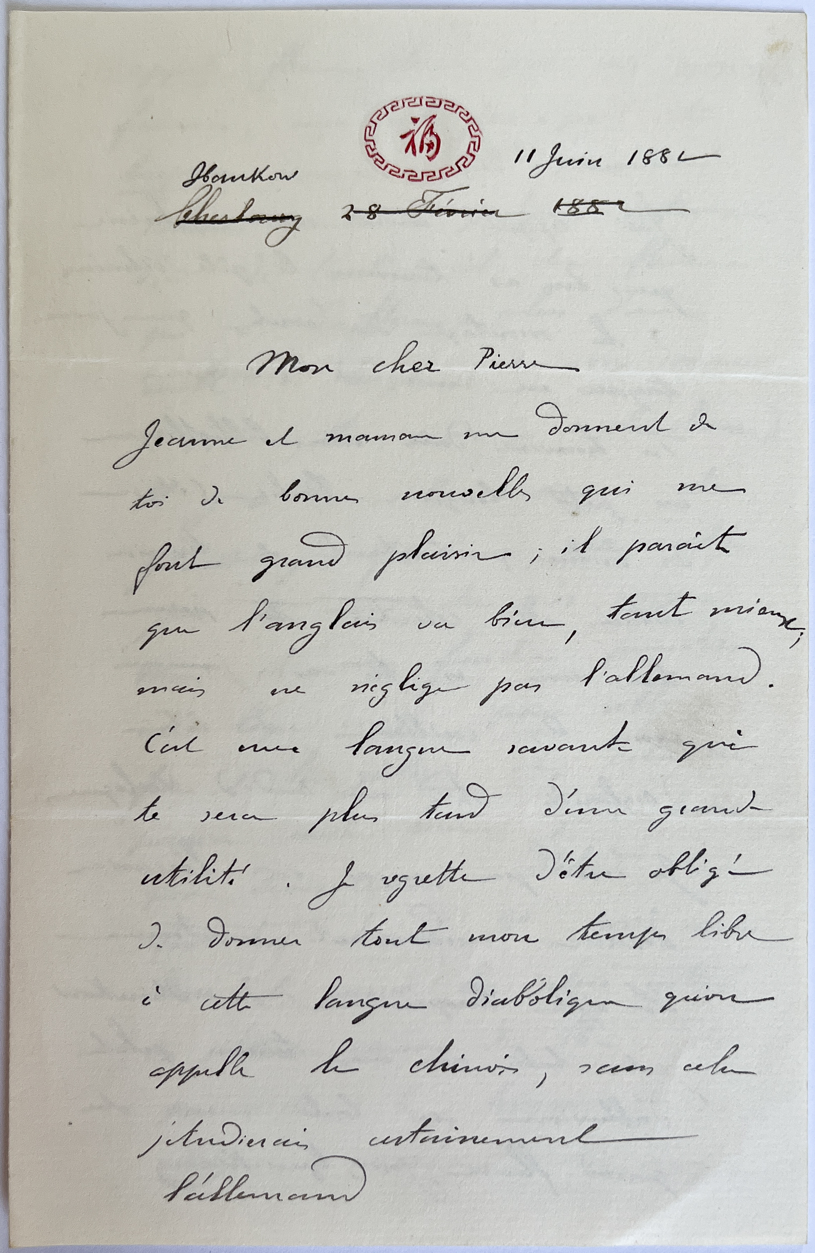 Jeanne et maman me donnent de toi de bonnes nouvelles qui me font grand plaisir ; il parait que l'anglais va bien, tant mieux mais ne néglige pas l'allemand. C'est une langue savante qui te sera plus tard d'une grande utilité. Je regrette d'être obligé de donner tout mon temps libre à cette langue diabolique qu'on appelle le chinois, sans cela j'étudierai certainement l'allemand.
