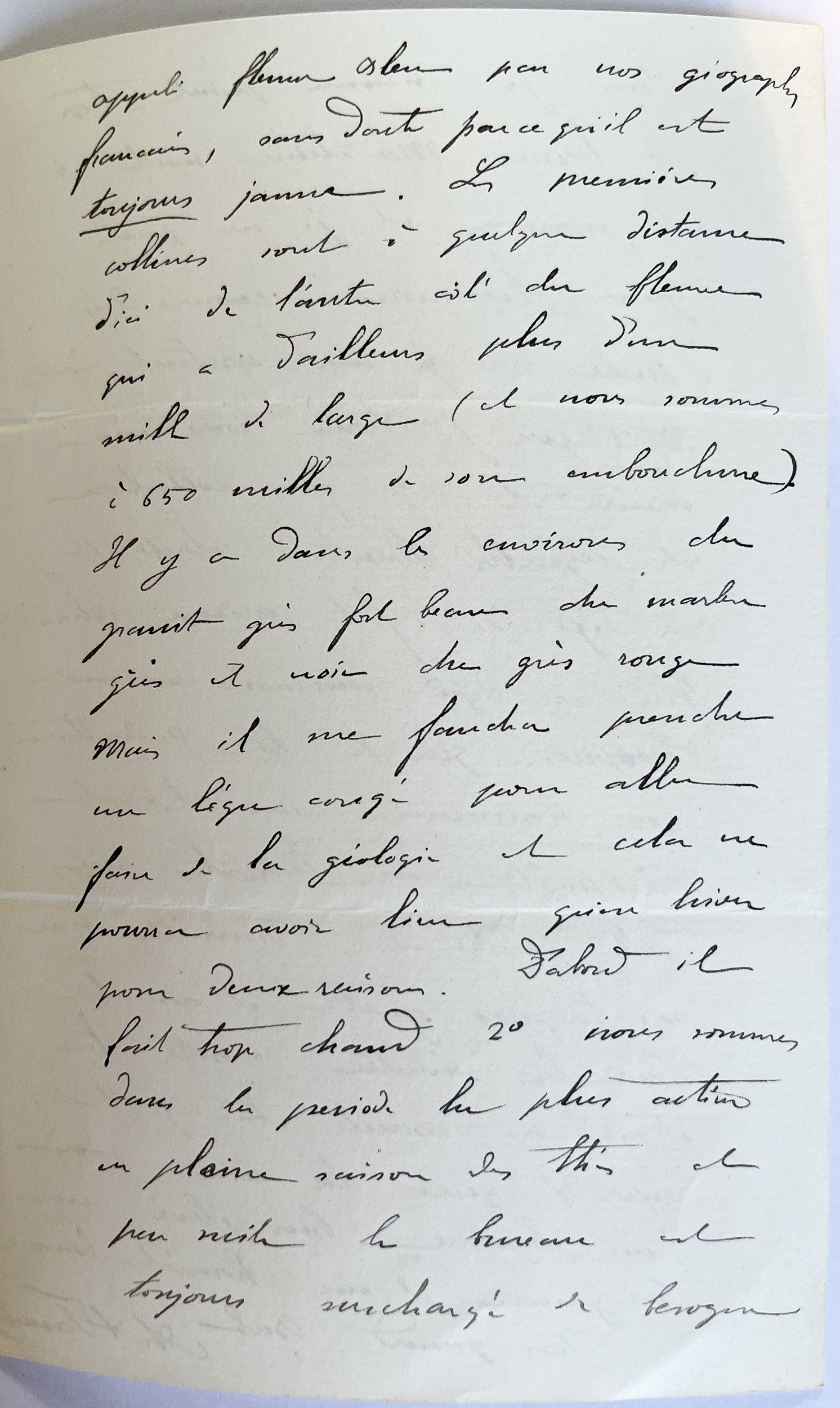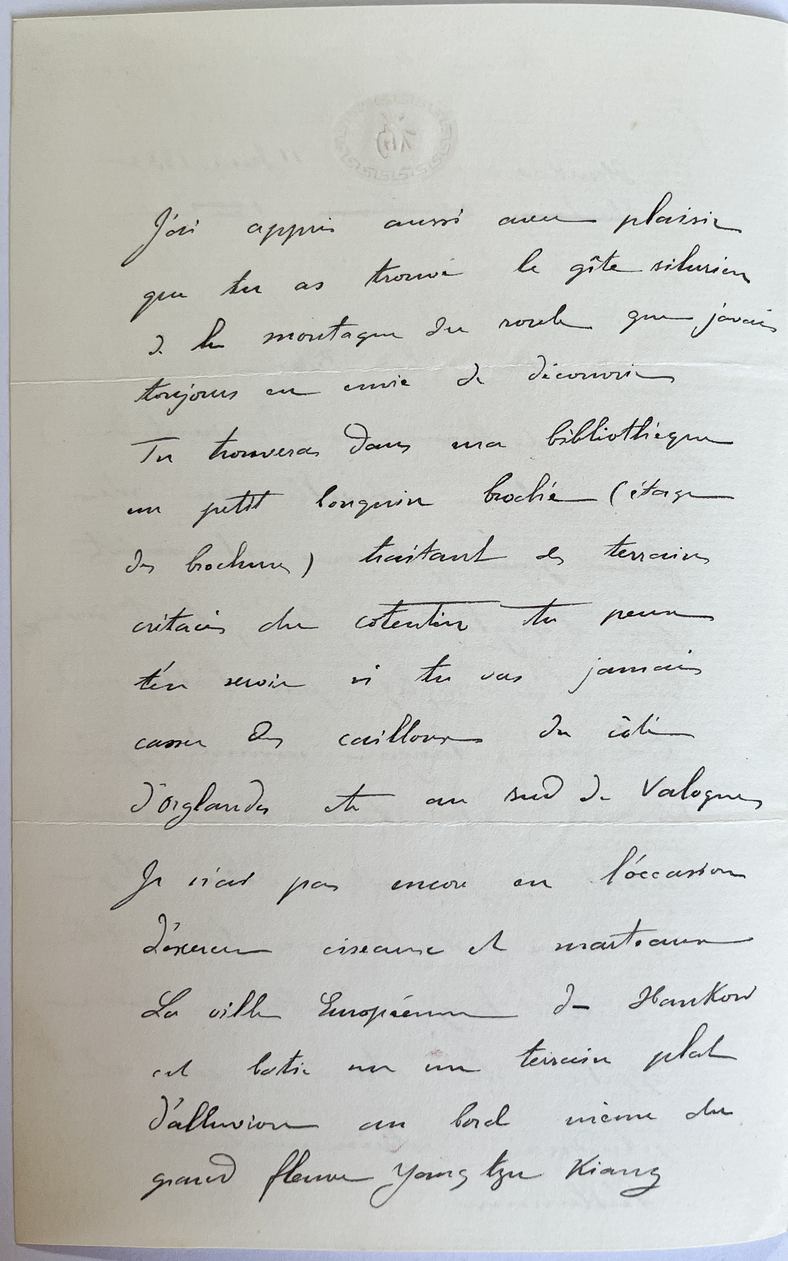 Il y a dans les environs du granit gris fort beau, du marbre gris et noir, du grès rouge. Mais il me faudra prendre un léger congé pour aller faire de la géologie et cela ne pourra avoir lieu qu'en hiver pour deux raisons. D'abord il fait trop chaud, secondo nous sommes dans la période la plus active en pleine saison des thés et par suite le bureau est toujours surchargé de besogne.