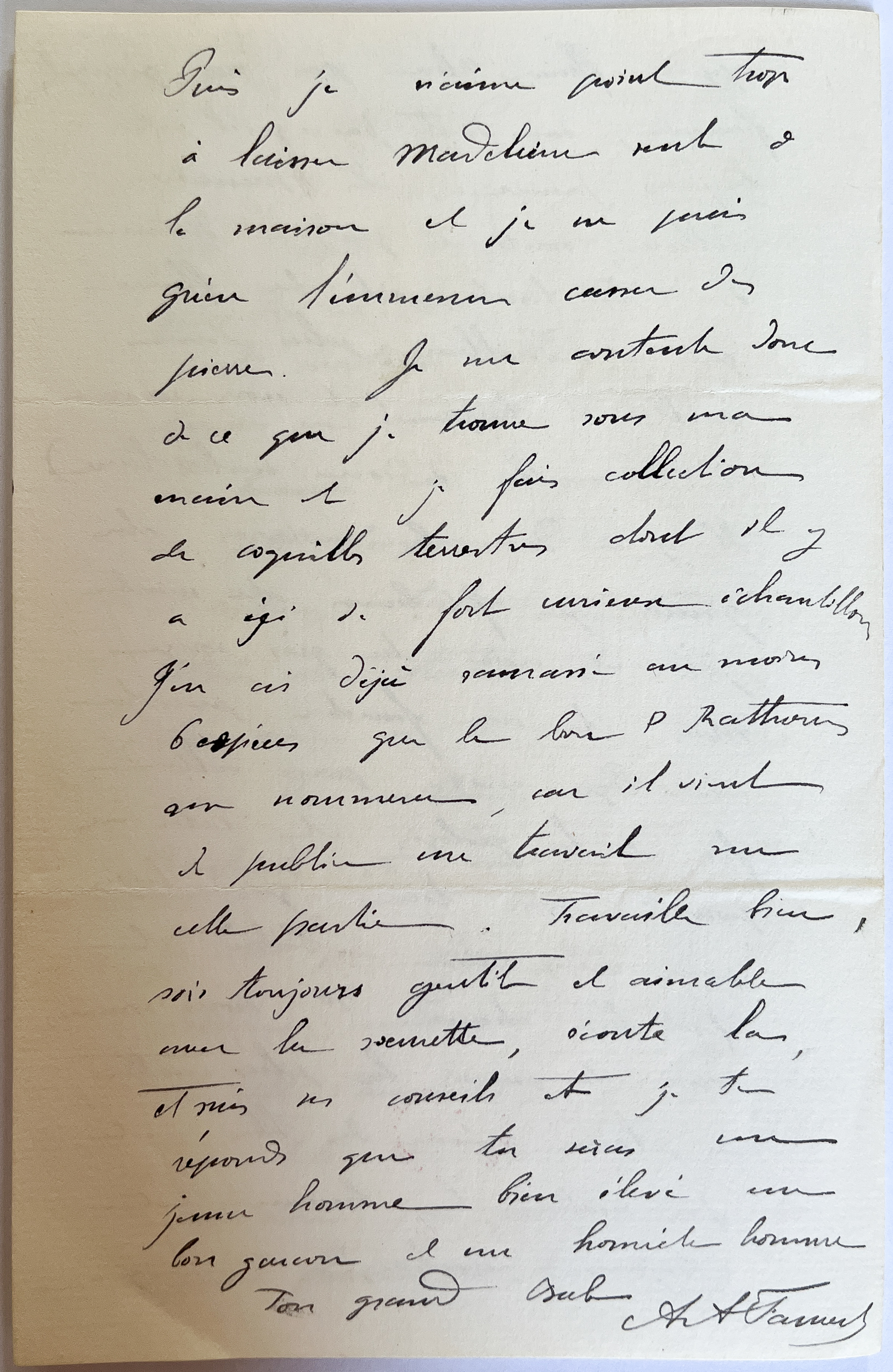 Puis je n'aime point trop à laisser Madeleine seule à la maison et je ne puis guère l'emmener casser des pierres. Je me contente donc à ce que je trouve sous ma main et je fais collection de coquilles terrestres, dont il y a ici de fort curieux échantillons. J'en ai déjà ramassé au moins 6 espèces que le bon Père Rathorin nous nommera, car il vient de publier un travail sur cette partie.