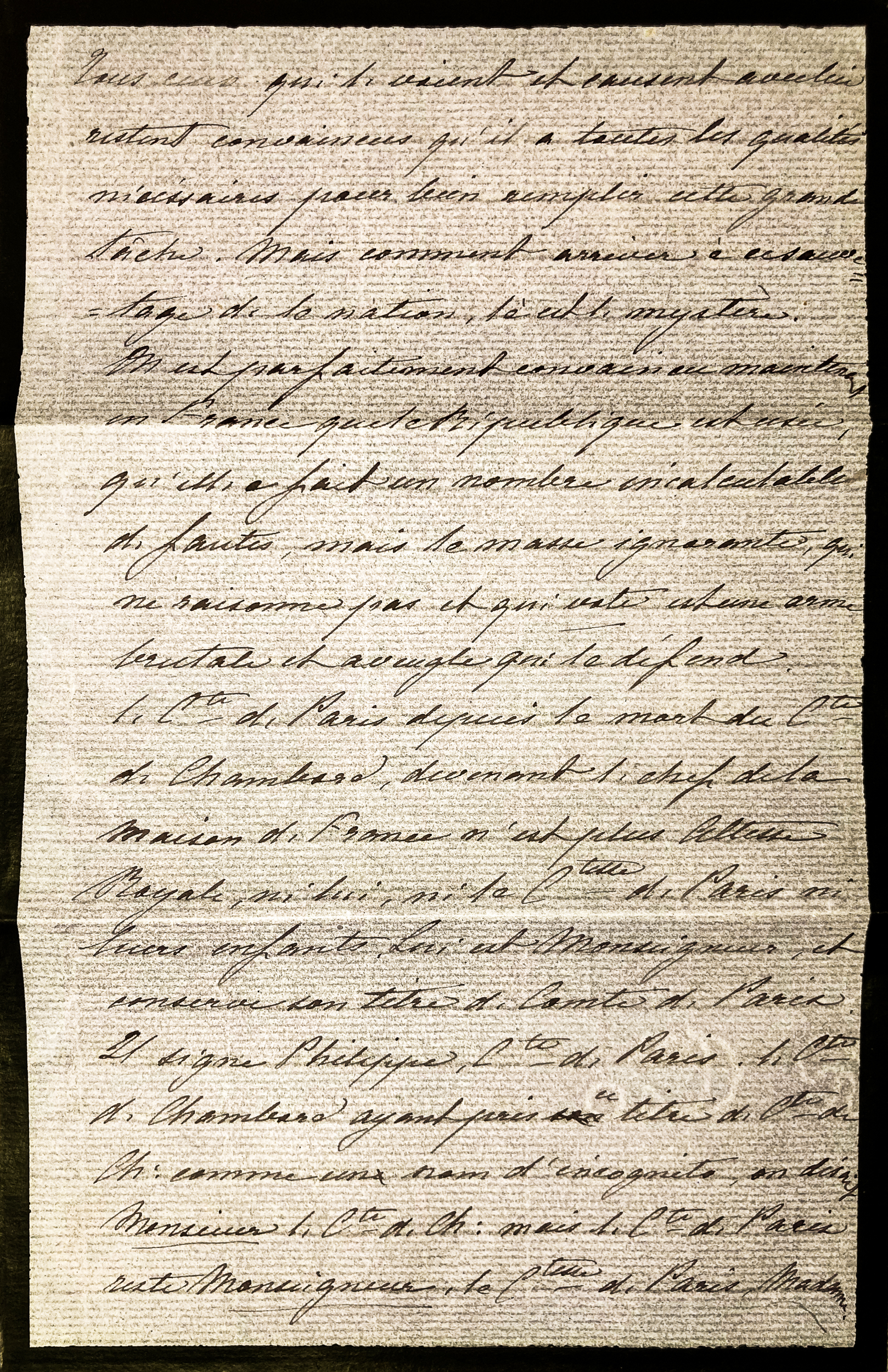 Après quelques considérations politiques, Mme de Beauvoir dresse la situation de la maison de France et l'on comprend que le Comte de Paris en est le représentant après la disparition du comte de Chambord.