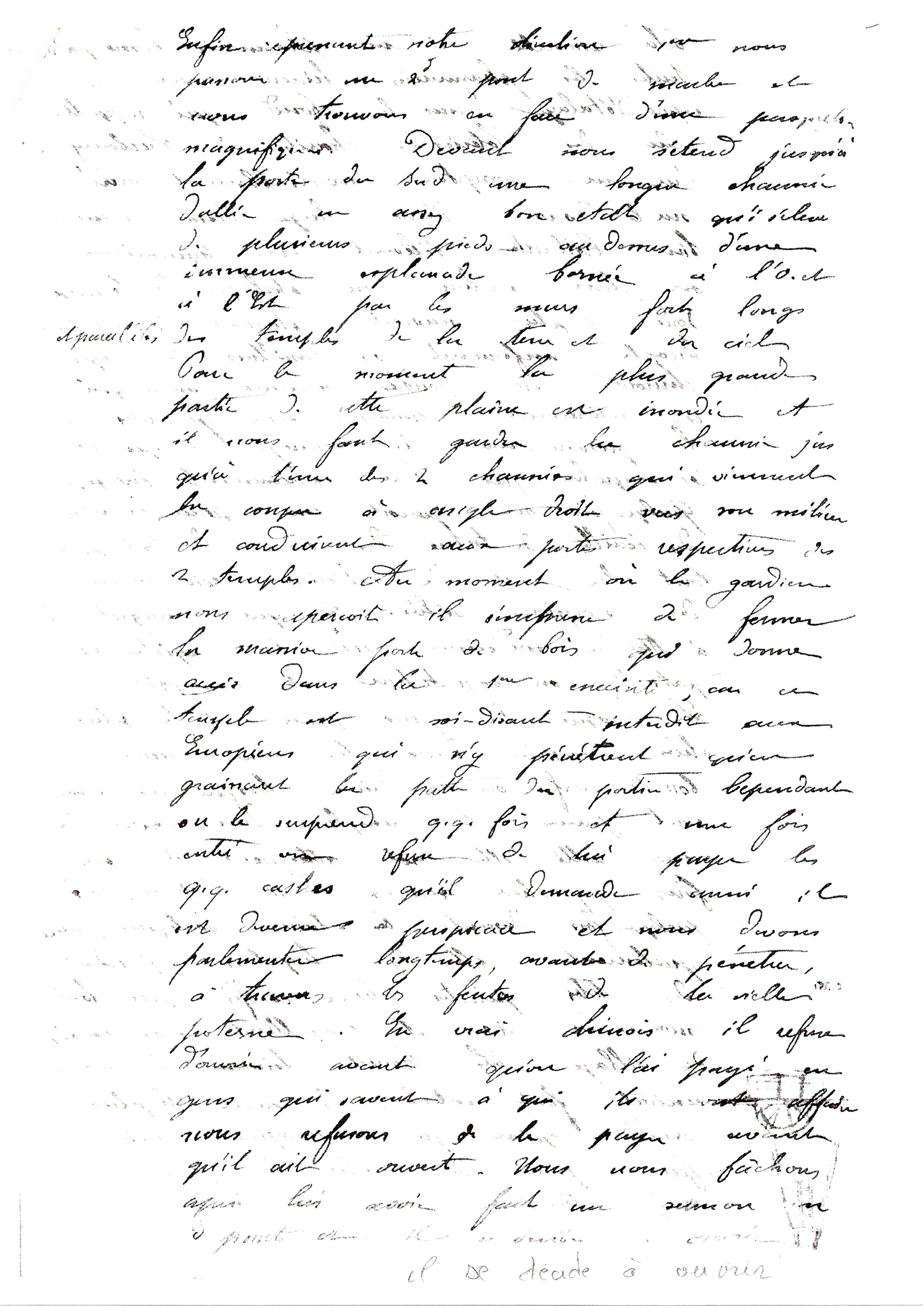 Au moment où le gardien nous aperçoit, il s’empresse de fermer la massive porte de bois qui donne accès dans la première enceinte, car elle est soi-disant interdite au européens qui n’y pénètrent qu’en graissant la patte du gardien. Cependant on le surprend quelquefois et, une fois entré, on refuse de lui payer les quelques cashs (?) qu’il demande, aussi il est devenu … (?) et nous devons parlementer longtemps avant de pénétrer à travers les fentes de la vieille poterne. En vrai chinois, il refuse d’ouvrir avant qu'on ne l'ait payé. En gens qui savent à qui ils ont affaire, nous refusons de le payer avant qu’il ait ouvert. Nous nous fâchons après lui avoir fait un sermon au point qu'il se décide à ouvrir.