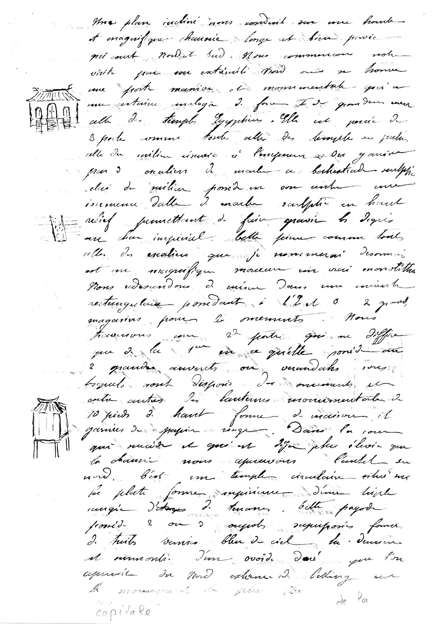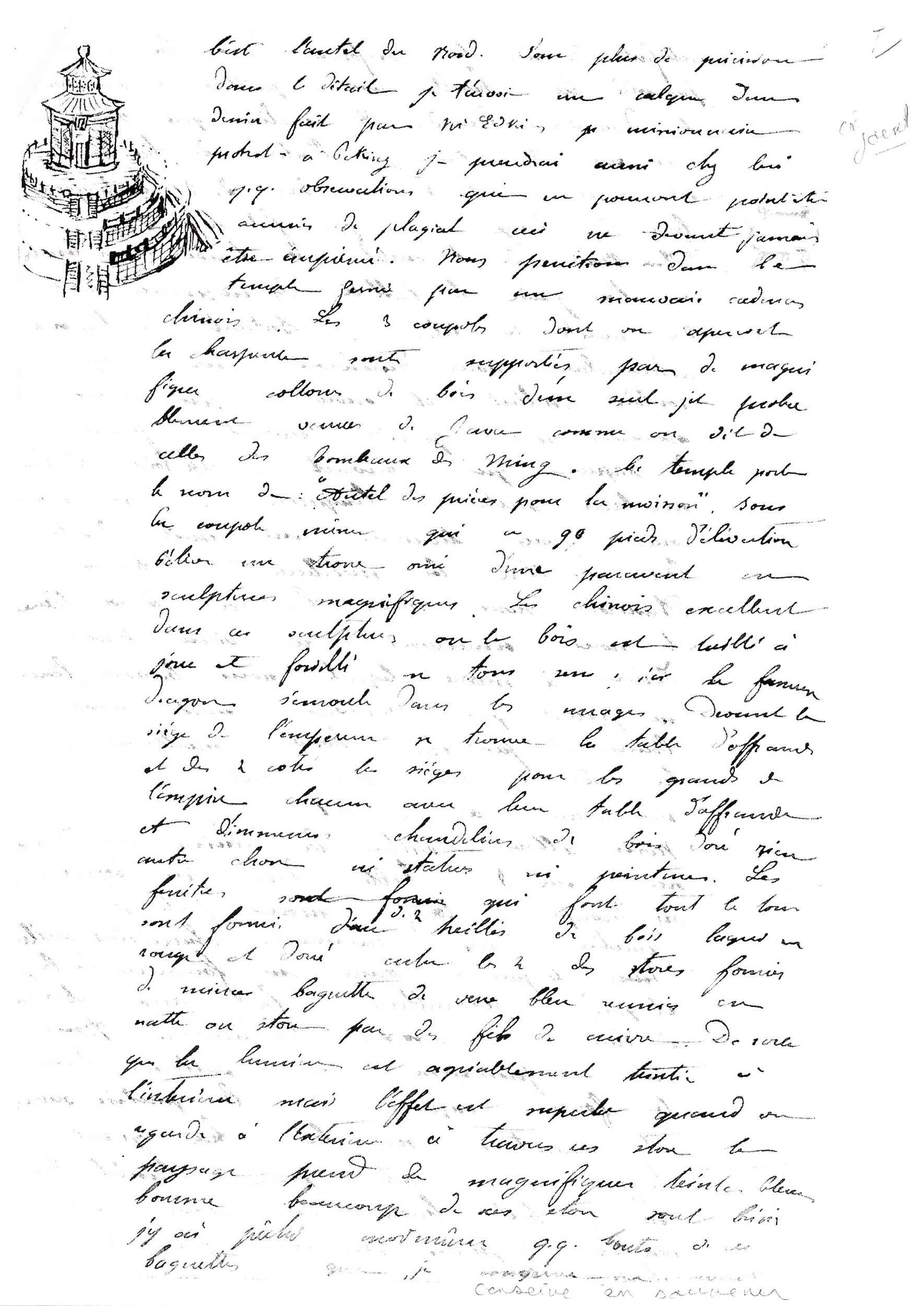 C’est l’autel du Nord. Pour plus de précision, dans le détail, je t’envoie un calque d’un dessin fait par M Edkin, missionnaire ... (?) à Peking. Je prendrai aussi chez lui quelques observations qui ne pourront point être accusé de plagiat, car ne devant jamais être imprimé.
