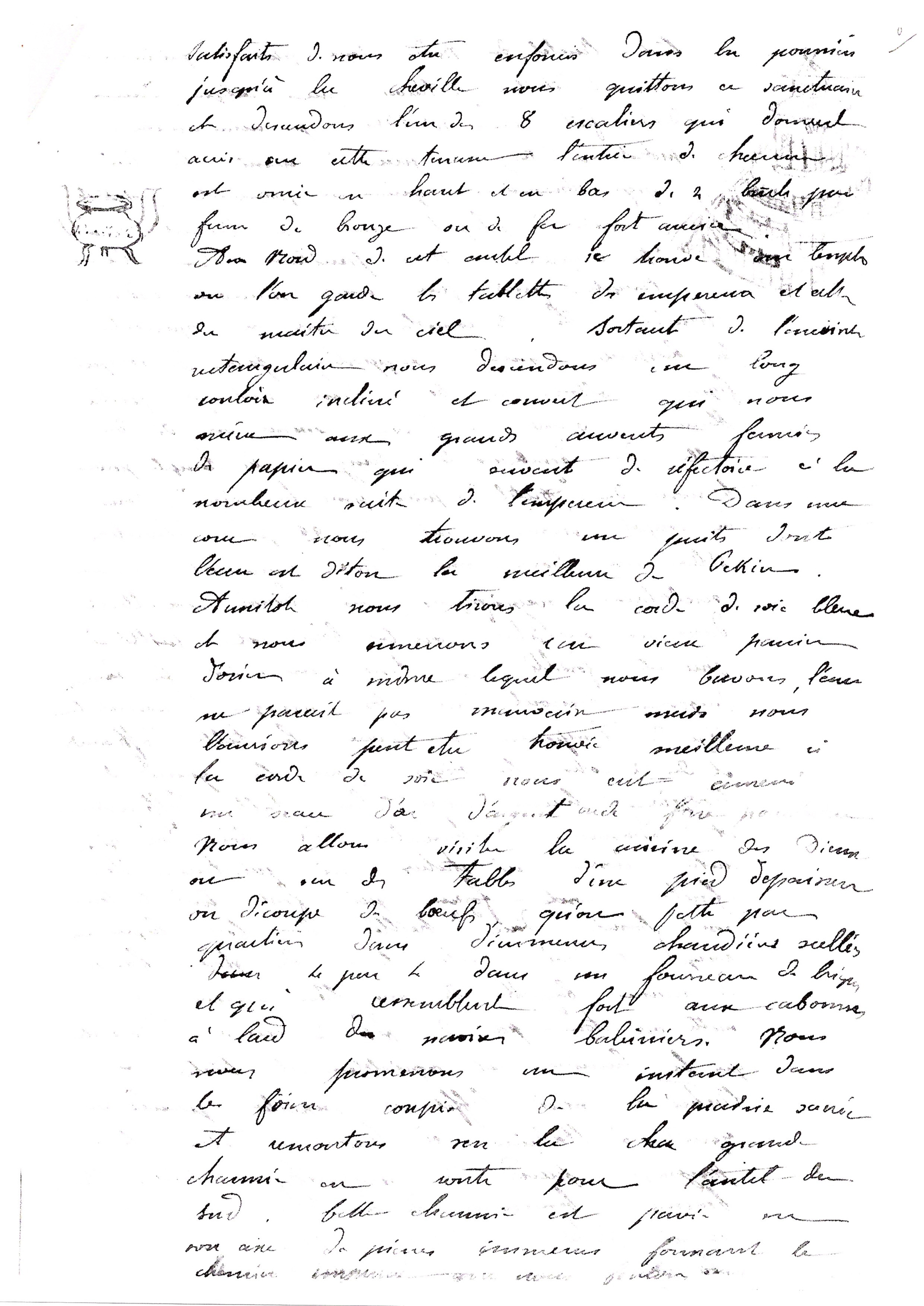 Dans une cour, nous trouvons un puits dont l’eau est, dit-on, la meilleure de Pékin. Aussitôt, nous tirons la corde de soie bleue et nous ramenons un vieux panier d'osier à même lequel nous buvons. L’eau ne paraît pas mauvaise mais nous l’aurions trouvée meilleure si la corde de soie nous eut amené un seau ... (?)