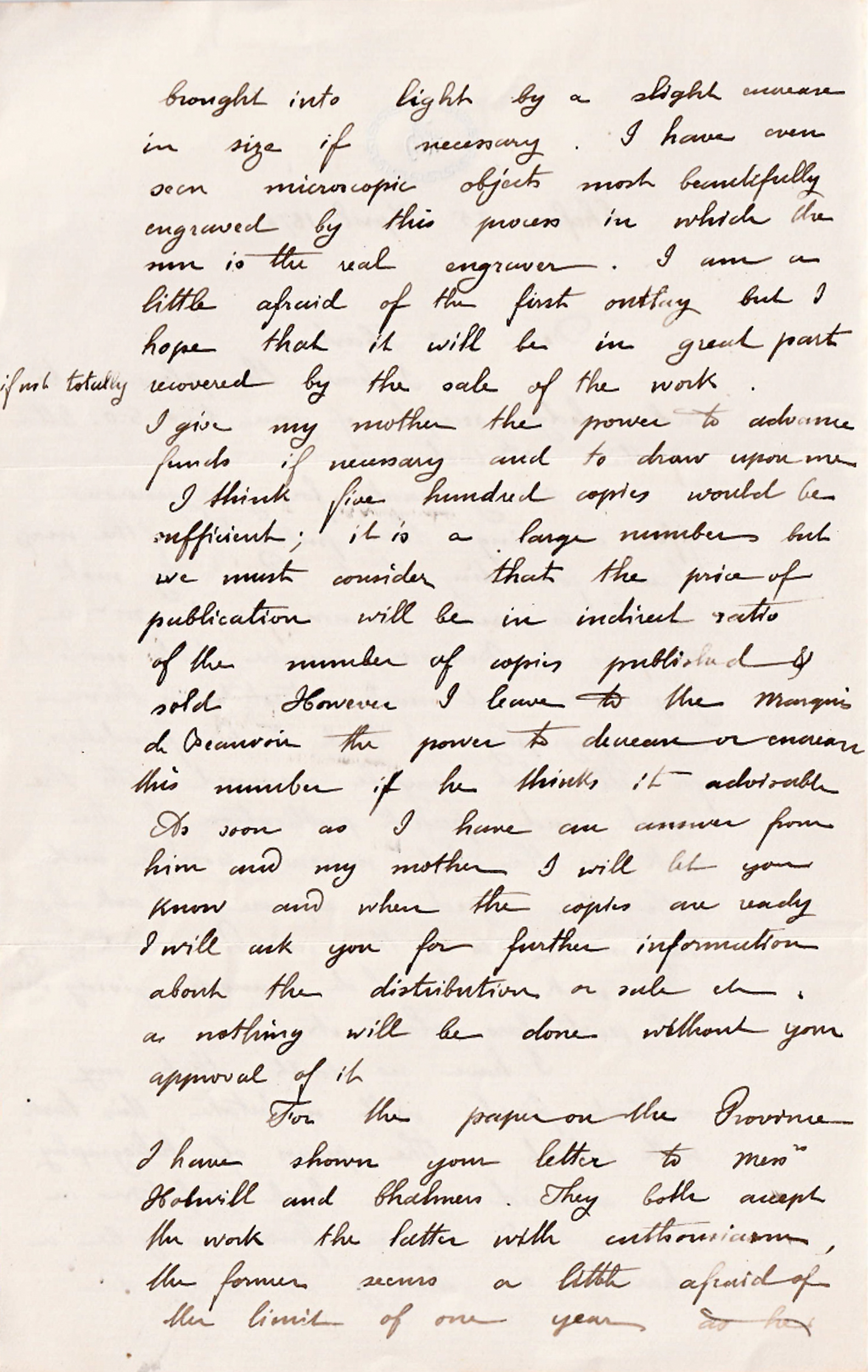 I give my mother the power to advance funds if necessary and to draw upon me. I think five hundred copies published and sold. However, I leave to the marquis de Beauvoir the power to decrease or increase this number if he thinks it advisable. As soon as I have an answer from him and my mother. I will let you know and when the copies are ready. I will ask you for further information about the distribution or sale … as nothing will be done without your approval of it.