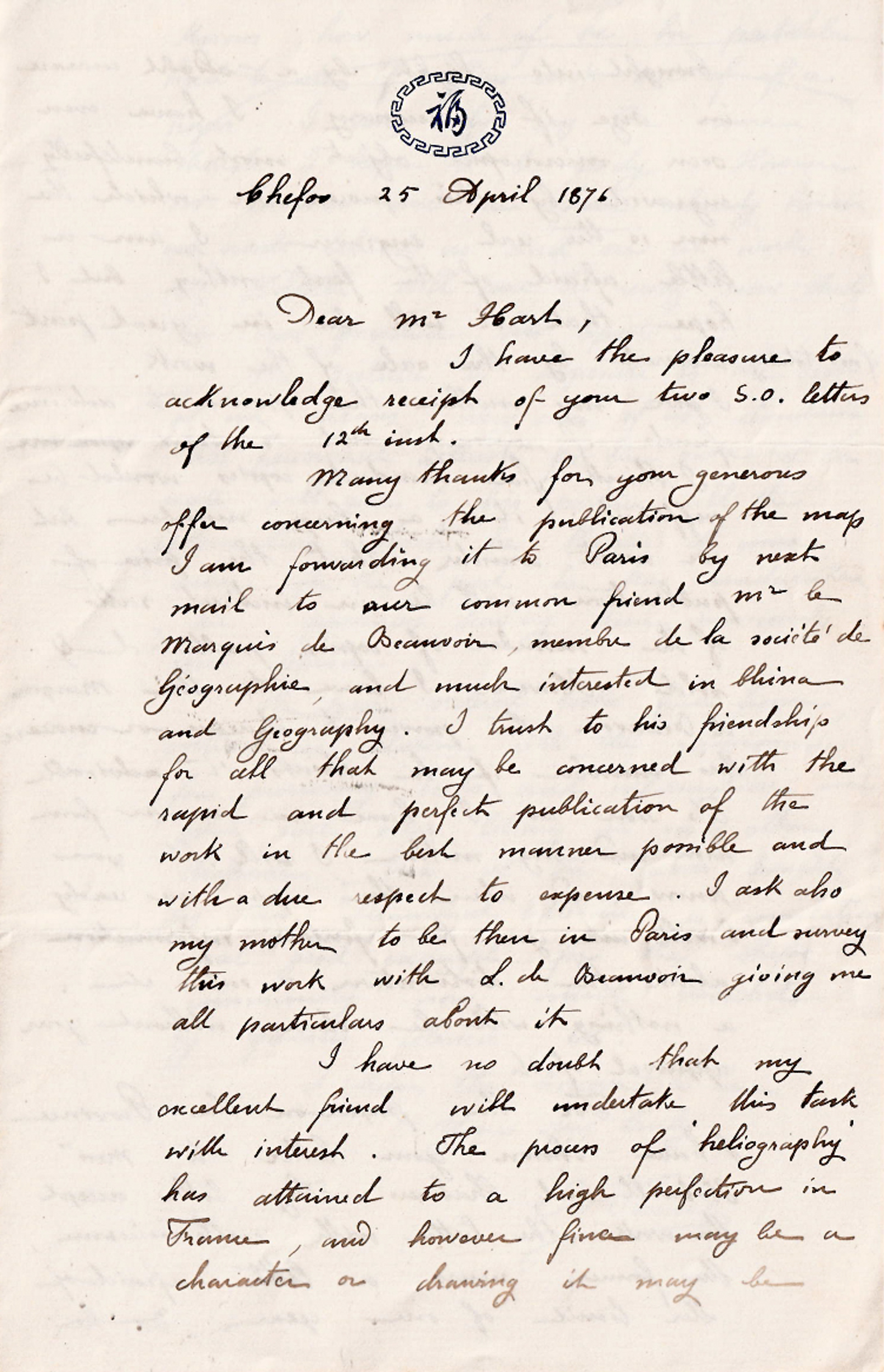 Mille mercis, pour votre généreuse offre concernant la publication des cartes. Je la transmettrai à Paris par notre prochain courriel à notre ami commun « Mr le marquis de Beauvoir membre de la société de géographie » très intéressé par la Chine et la géographie. Je fais confiance à son amitié pour tout ce qui peut concerner la rapide et parfaite publication du travail de la meilleur manière possible et dans le respect du coût. J’ai également demandé à ma mère d’être à Paris et de surveiller le travail avec L. de Beauvoir me donnant tous les détails à ce sujet.