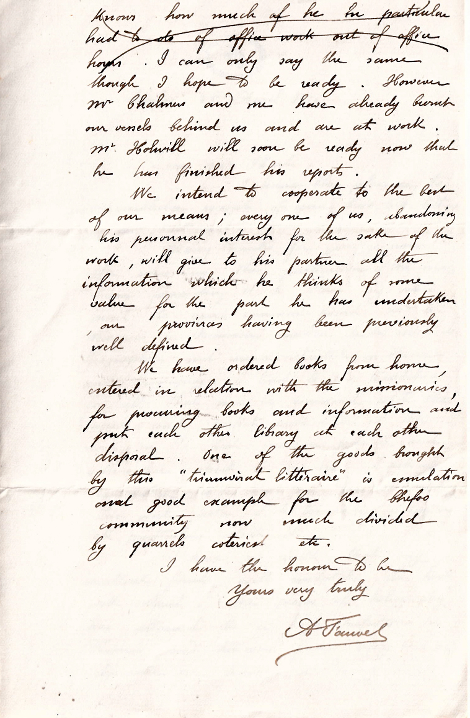 Pour le papier sur la Province, j’ai montré votre lettre à messieurs Hobwill et Bhalmers. Ils ont accepté le travail le dernier avec enthousiasme le premier a été un peu effrayé par la limite d’une année comme il sait combien de sa part il … particulier doit travailler au bureau en dehors des heures de bureau. Je peux seulement dire la même chose j’espère être prêt. Cependant Mr Bahmers et moi sommes prêt à faire éclater notre bateau derrière nous nous sommes au travail. Mr Hobwill sera bientôt prêt maintenant qu’il a fini son rapport.