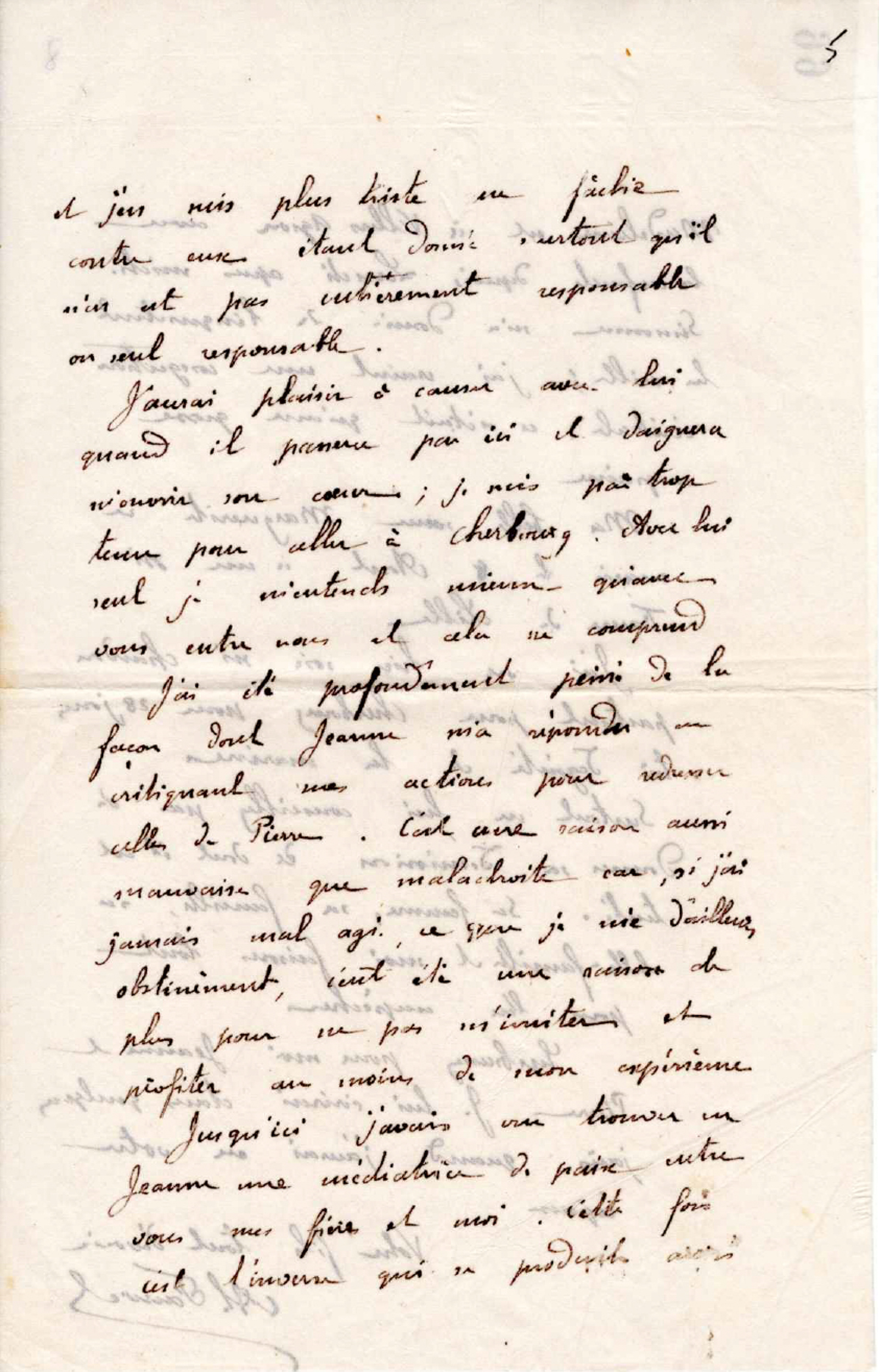 J’aurai plaisir à causer avec lui quand il passera par ici et daignera m’ouvrir son coeur ; je suis pas trop tenu pour aller à Cherbourg. Avec lui seul, je m’entends mieux qu’avec vous entre nous et cela se comprend. J’ai été profondément peiné de la façon dont Jeanne m’a répondu en critiquant mes actions pour redresser celles de Pierre. C’est une raison aussi mauvaise que maladroite, car si j’ai jamais mal agi, ce que je nie d’ailleurs obstinément, c’eut été une raison de plus de ne pas m’imiter et profiter au moins de mon expérience.