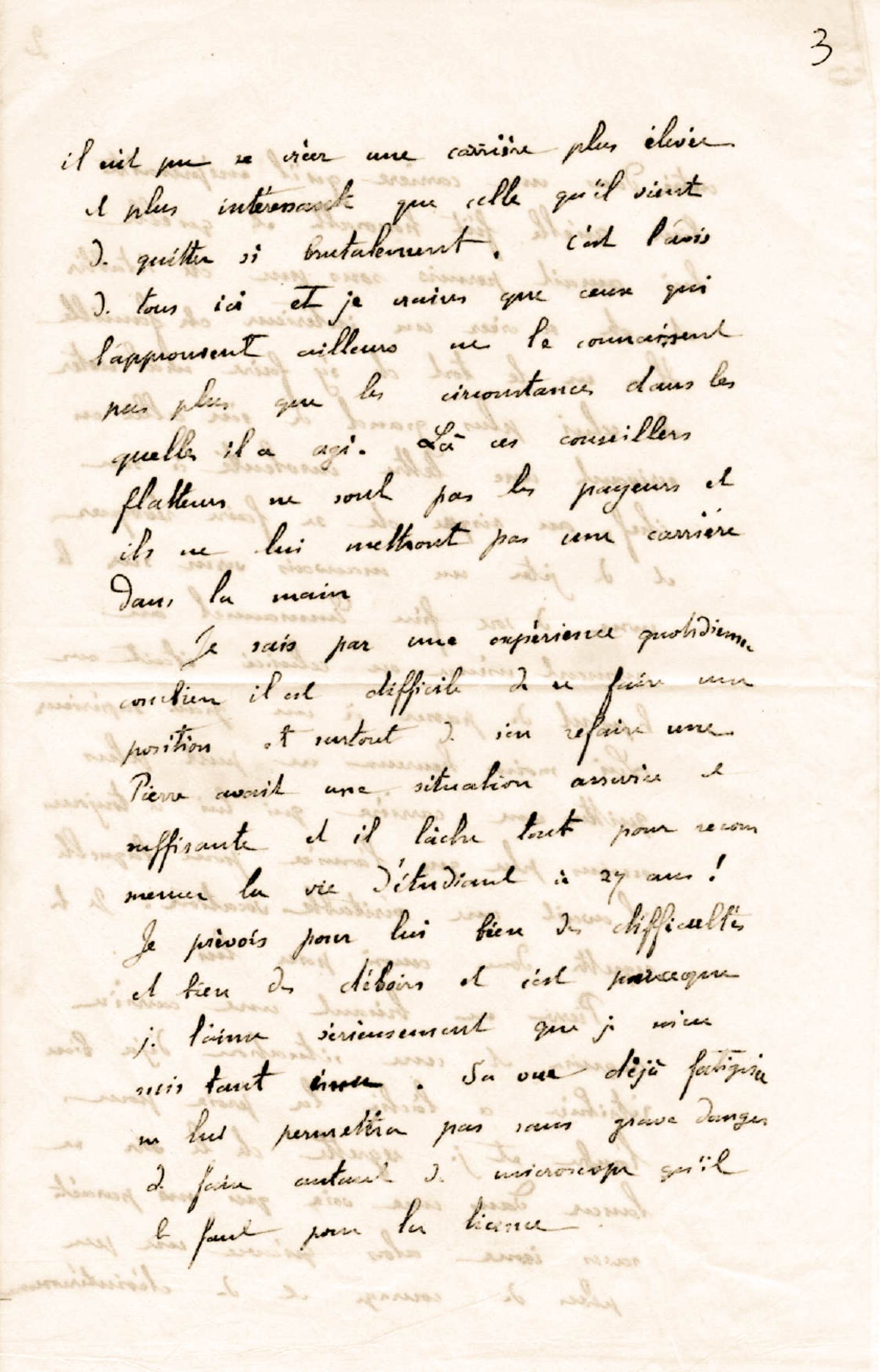 Je sais, par une expérience quotidienne, combien il est difficile de se faire une position et surtout de s’en refaire une. Pierre avait une situation assurée et suffisante et il lâche tout pour recommencer la vie d'étudiant à 27 ans !