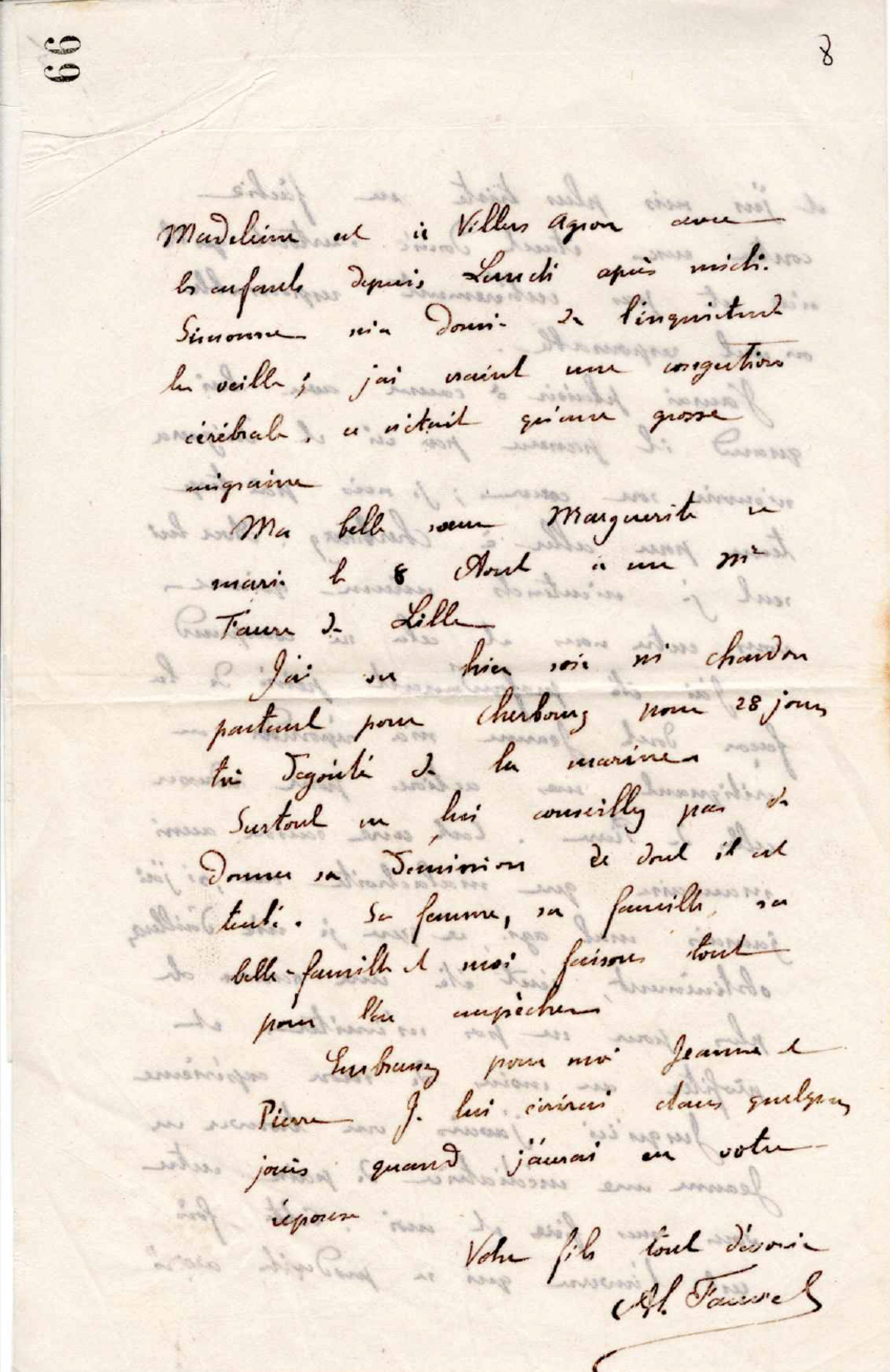 J’ai vu hier M Chardon partant pour Cherbourg pour 28 jours, très dégoûté de la marine. Surtut ne lui conseillez pas de donner sa démission, ce dont il est tenté. Sa femme, sa famille, sa belle famille et moi faisons tout pour l’en empêcher.