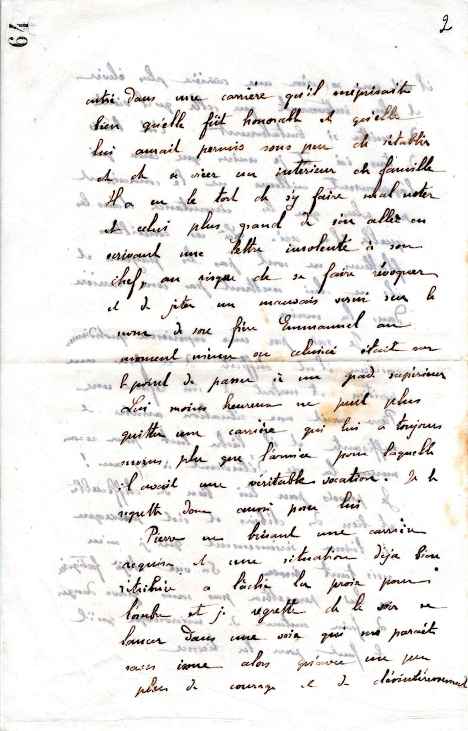 Connaissant les détails de l’affaire de Pierre, je ne puis l’approuver d’être entré dans une carrière qu’il méprisait, bien qu’elle fut honorable et qu’elle lui aurait permis, sous peu de s’établir et de se créer un intérieur de famille. Il a eu le tort de s’y faire mal noter, et celui plus grand, de s’en aller en écrivant une lettre insolente à son chef, au risque de se faire révoquer et de jeter un mauvais … sur le nom de son frère Emmanuel au moment même où celui ci était sue le point de passer à un grade supérieur.