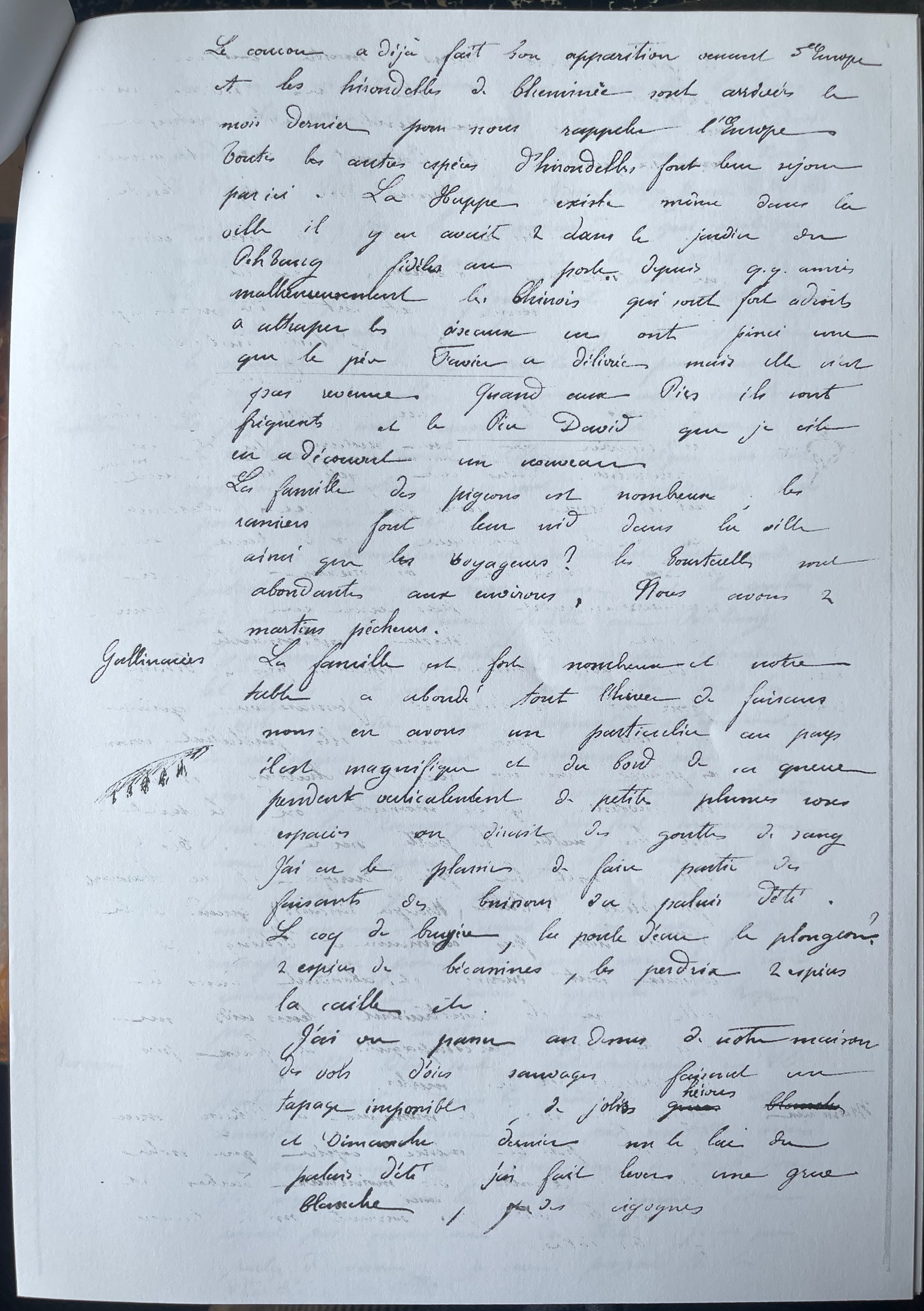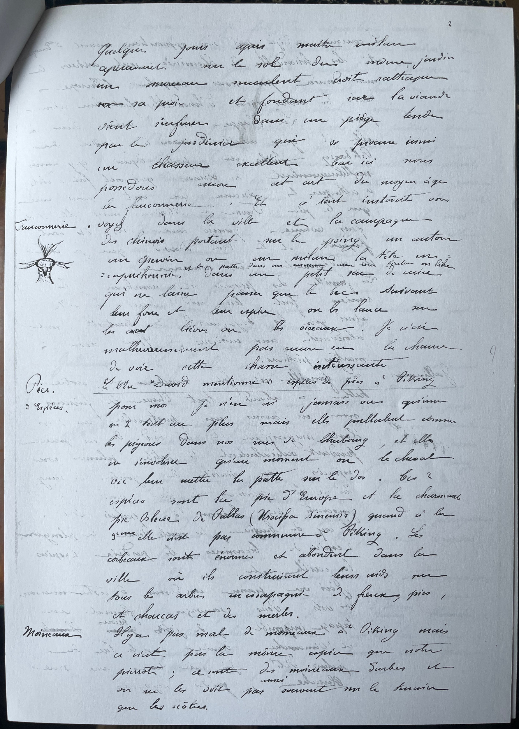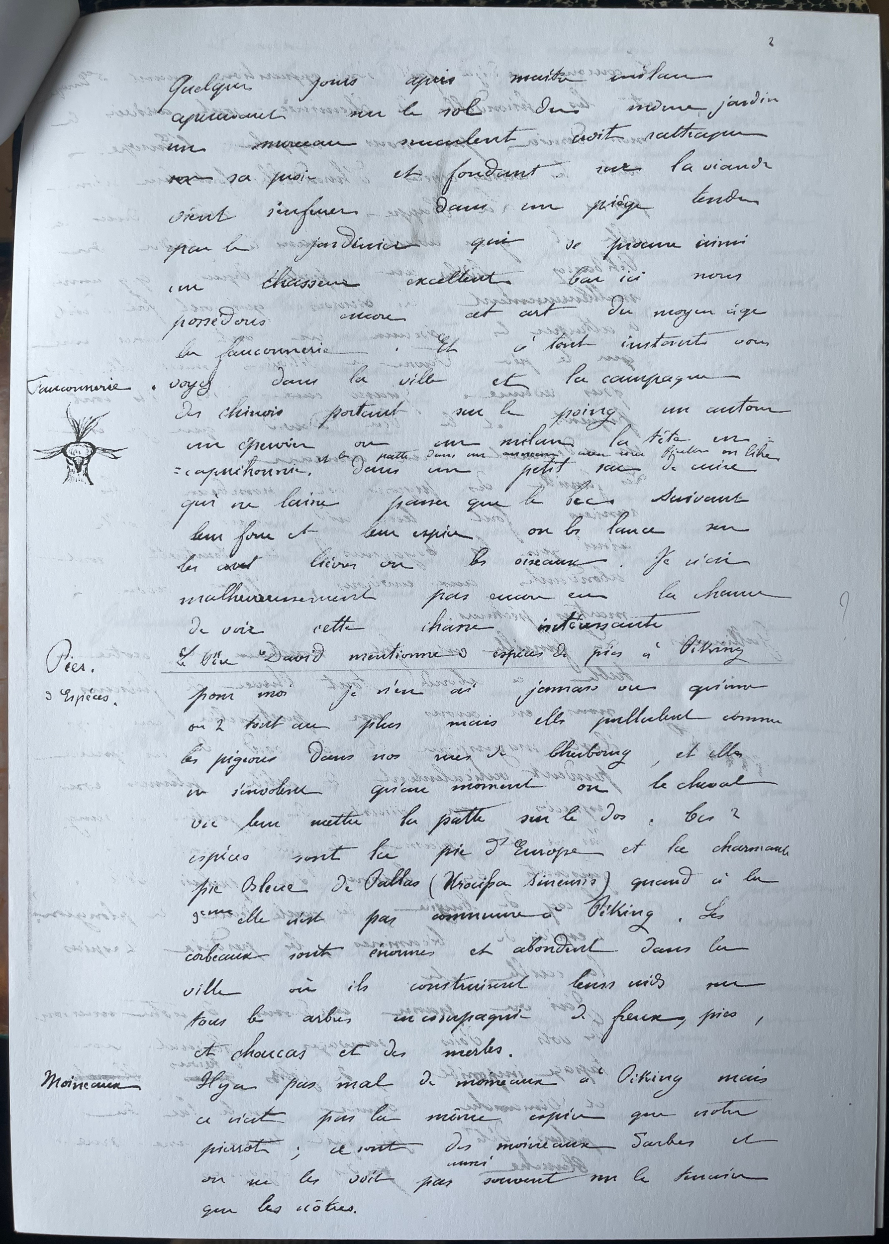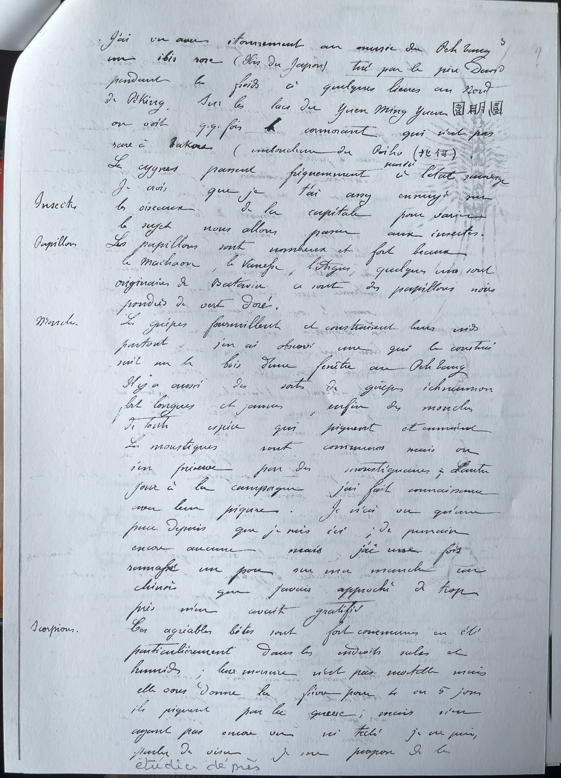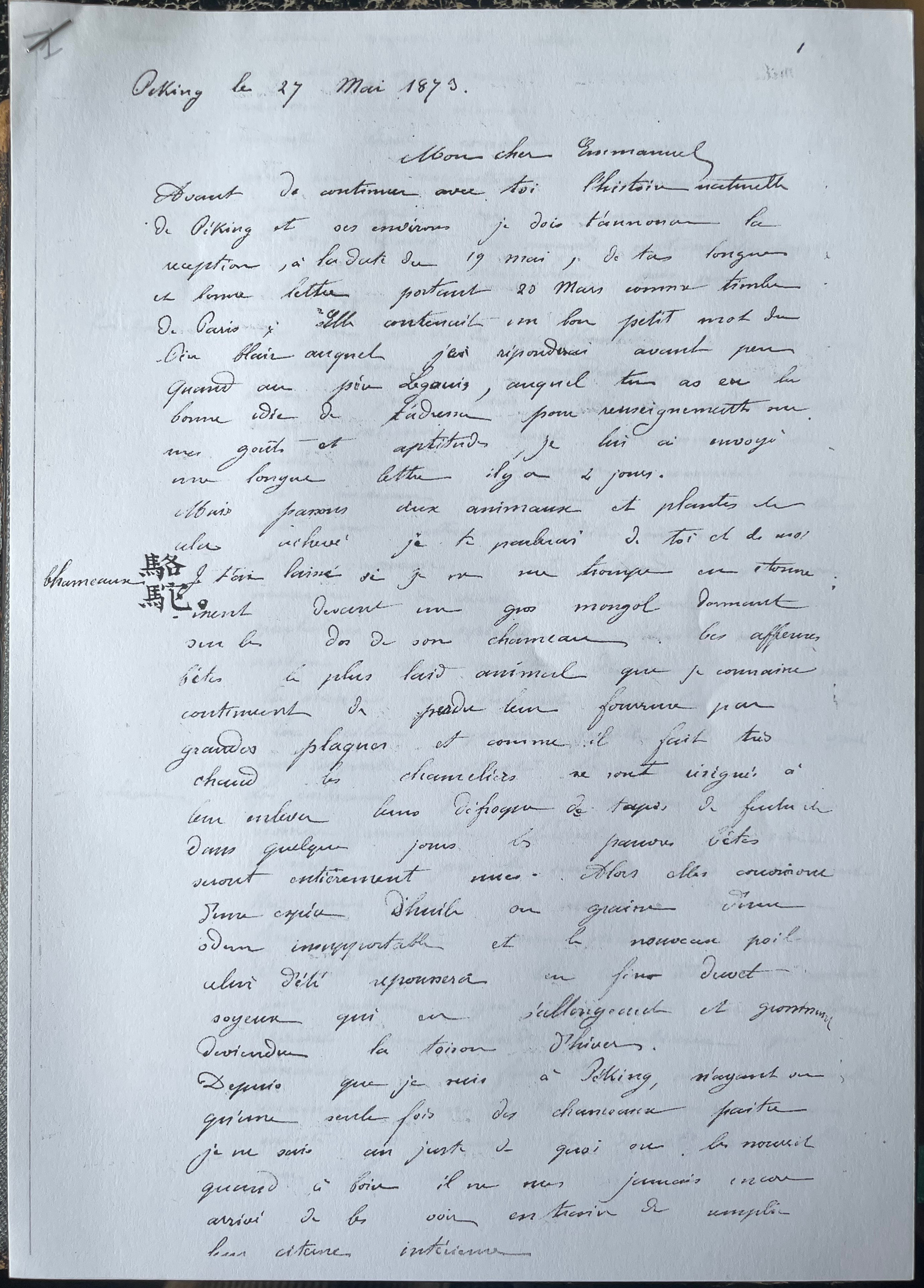 Avant de continuer avec toi l’histoire naturelle de Pékin et ses environs, je t‘annonce la réception, à la date du 19 mai, de ta longue et bonne lettre portant 20 mars comme timbre de Paris. Elle contenait un bon petit mot du Père Blair auquel je répondrai avant peu. Quand au Père Legouis, auquel tu as eu la bonne idée de t’adresser pour renseignements sur mes goûts et aptitudes, je lui ai envoyé une longue lettre il y a deux jours.