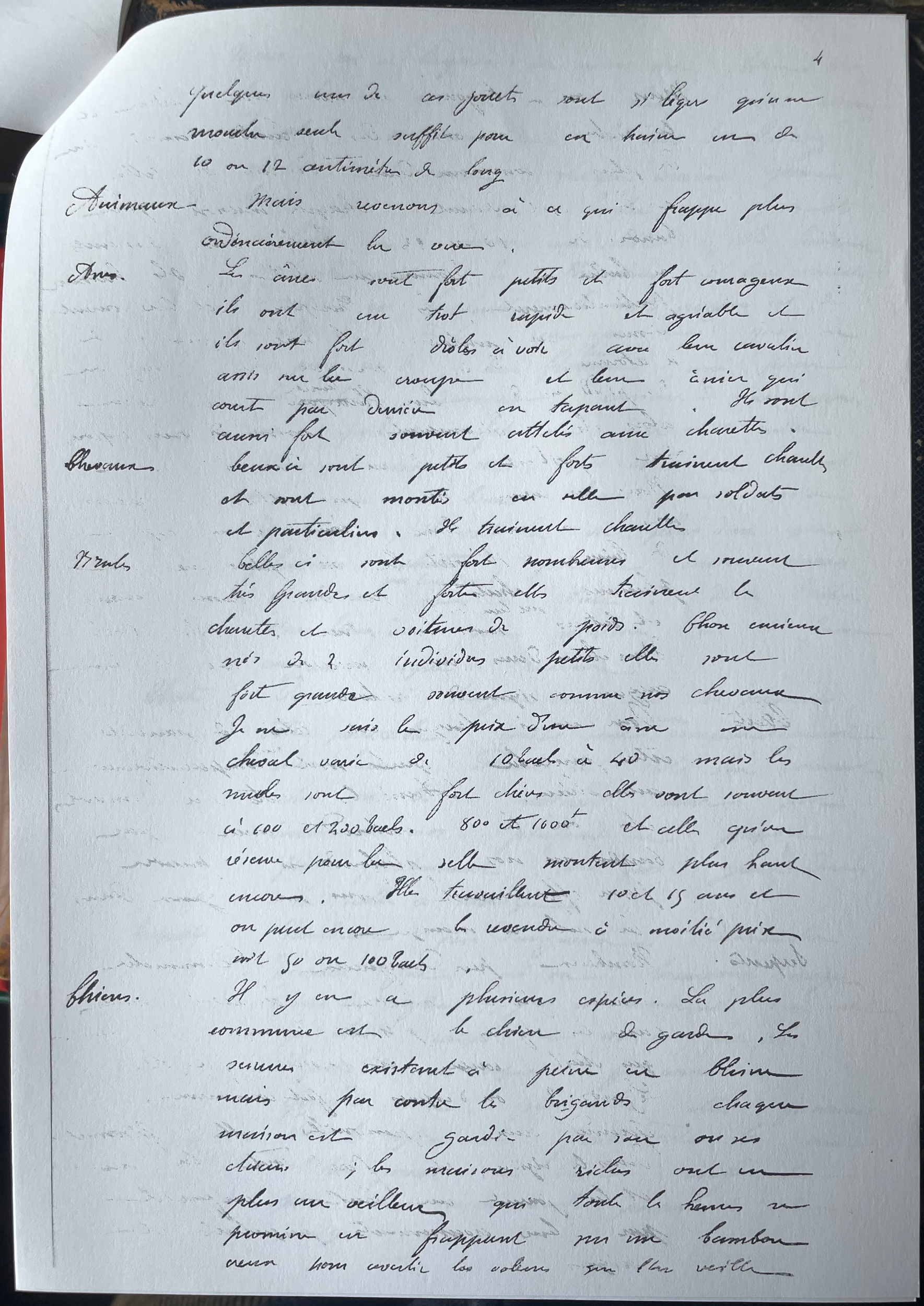 Leur poil est fort rude, dur et raide. Nous en avons un qui entre ... (?) quasi noir ... (?) d’une espèce de laisse. Ils ont la vie plus dure que plusieurs chats. J’ai vu casser cannes et bâtons sur leur dos sans les tuer.